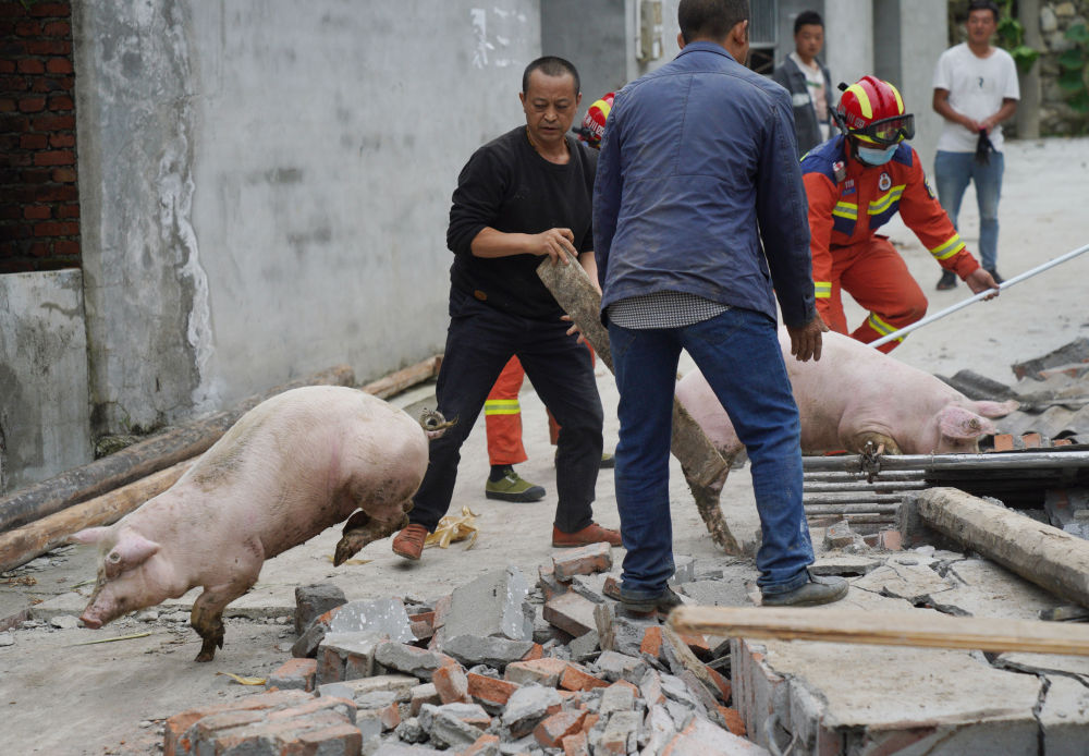 9月7日,在幸福村二組,消防救援隊員協(xié)助村民從倒塌的豬圈中轉(zhuǎn)移豬。