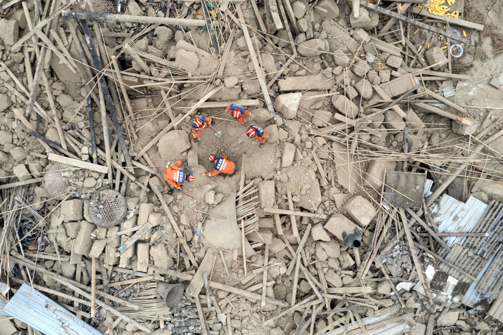 9月7日,在幸福村二組,四川眉山消防救援隊隊員幫助村民在倒塌的房屋中找尋物品(無人機(jī)照片)。