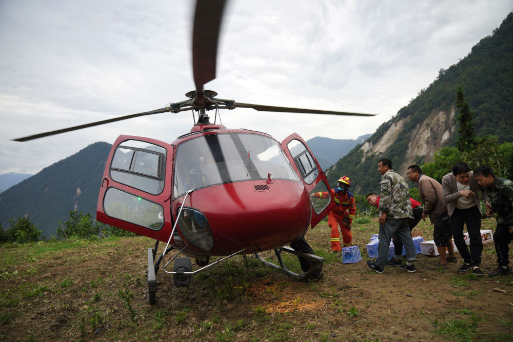 9月7日,在幸福村二組,村民與消防救援隊員搬運(yùn)直升機(jī)送來的水和食物。