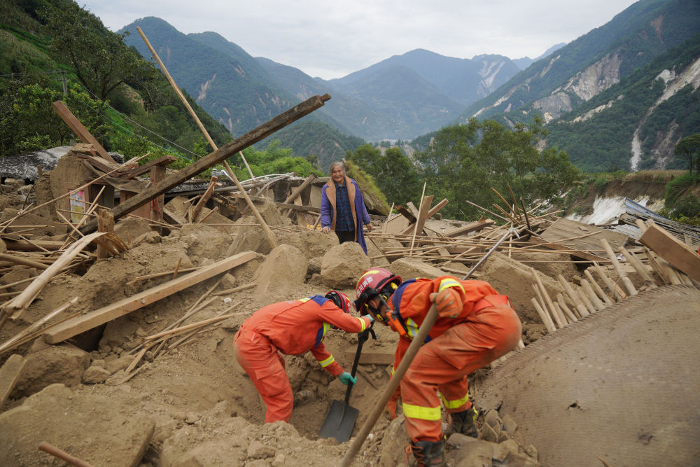 9月7日,四川眉山消防救援隊隊員在幸福村二組,幫助村民在倒塌的房屋中找尋物品。