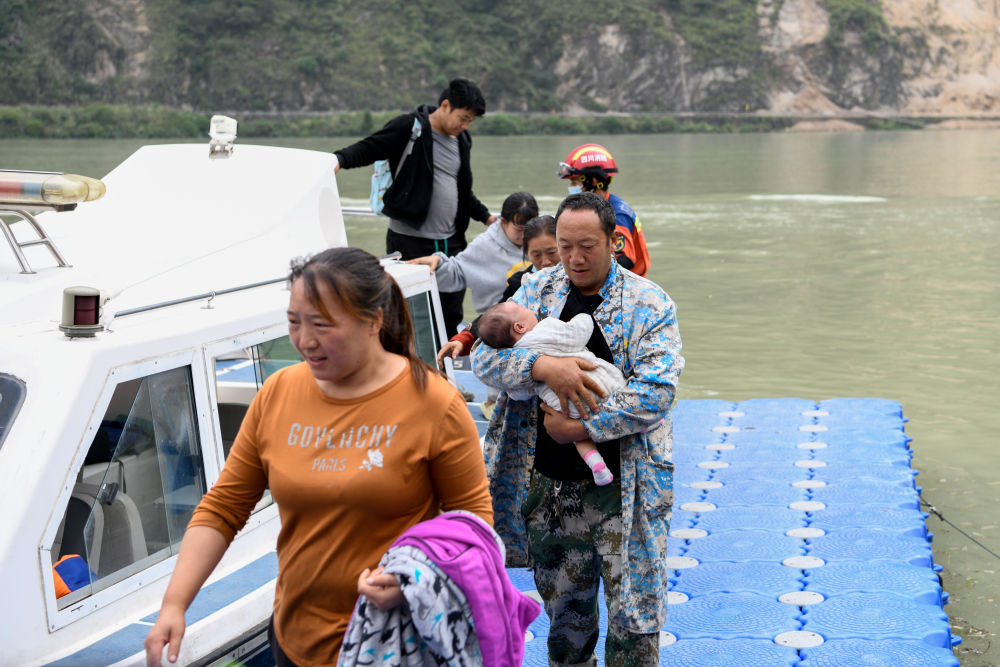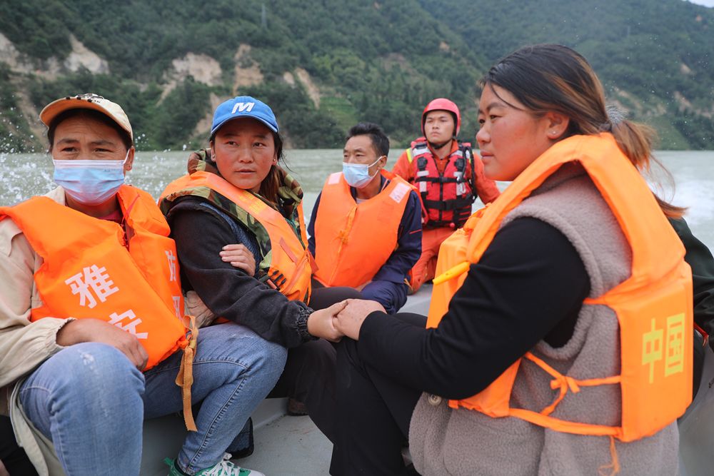 ↑9月8日,在四川石棉縣新民鄉(xiāng)臨時碼頭,救援人員駕駛沖鋒舟護(hù)送受災(zāi)群眾回家。