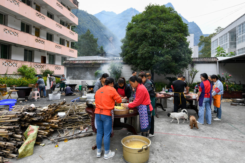 9月7日,在草科鄉(xiāng)政府安置點(diǎn)內(nèi),當(dāng)?shù)厝罕姙樵趫鼍仍藛T準(zhǔn)備飯菜。
