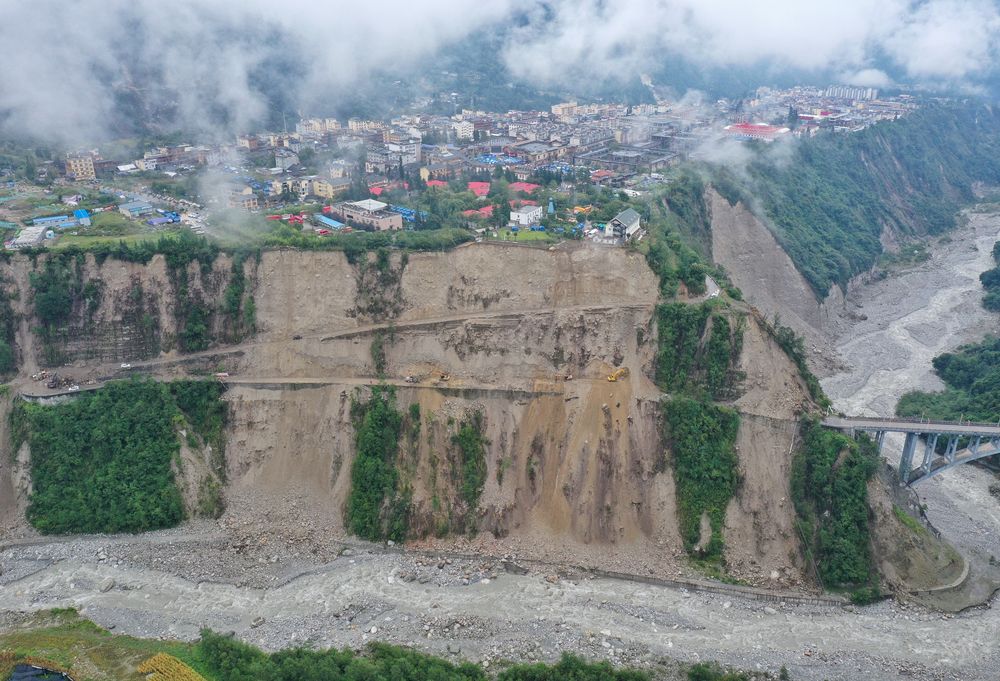 9月7日,在磨西鎮(zhèn)附近,四川路橋的工作人員在搶修通往海螺溝景區(qū)的道路(無人機(jī)照片)。