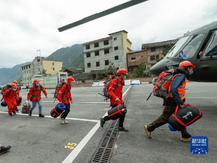 9月7日,在四川省甘孜州瀘定縣磨西鎮(zhèn),四川省冶勘設(shè)計(jì)集團(tuán)有限公司的6名調(diào)查隊(duì)員攜帶裝備搭乘直升機(jī)前往海螺溝景區(qū)開展地質(zhì)災(zāi)害應(yīng)急排查工作。新華社記者 沈伯韓 攝