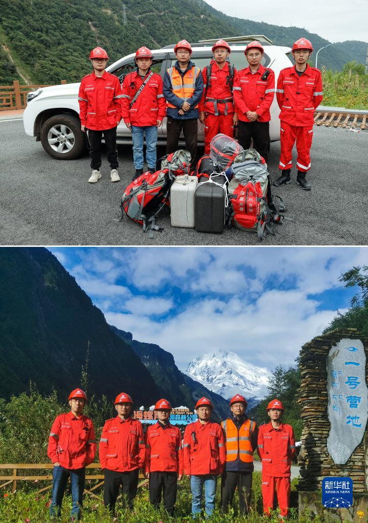 這是一張拼版照片,上圖為:9月7日,四川省冶勘設(shè)計(jì)集團(tuán)有限公司的6名調(diào)查隊(duì)員在搭乘直升機(jī)去往海螺溝前拍攝的合影(新華社記者沈伯韓攝);下圖為:9月10日,6名調(diào)查隊(duì)員在海螺溝景區(qū)一號營地拍攝的合影(四川省冶勘設(shè)計(jì)集團(tuán)有限公司供圖)。新華社發(fā)