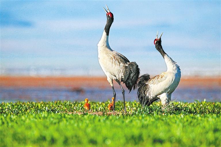 棲息在碌曲尕海濕地的國家一級(jí)保護(hù)動(dòng)物黑頸鶴。新甘肅·甘肅日?qǐng)?bào)通訊員 張勇