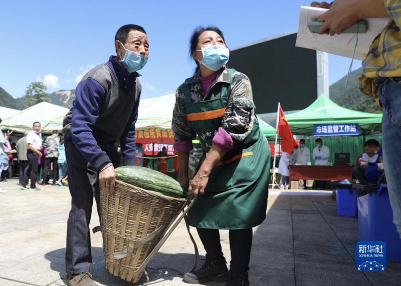 9月10日,在四川省石棉縣王崗坪鄉(xiāng)安置點(diǎn)內(nèi),謝欽明(左)為安置點(diǎn)送來(lái)南瓜。新華社記者 劉瓊 攝