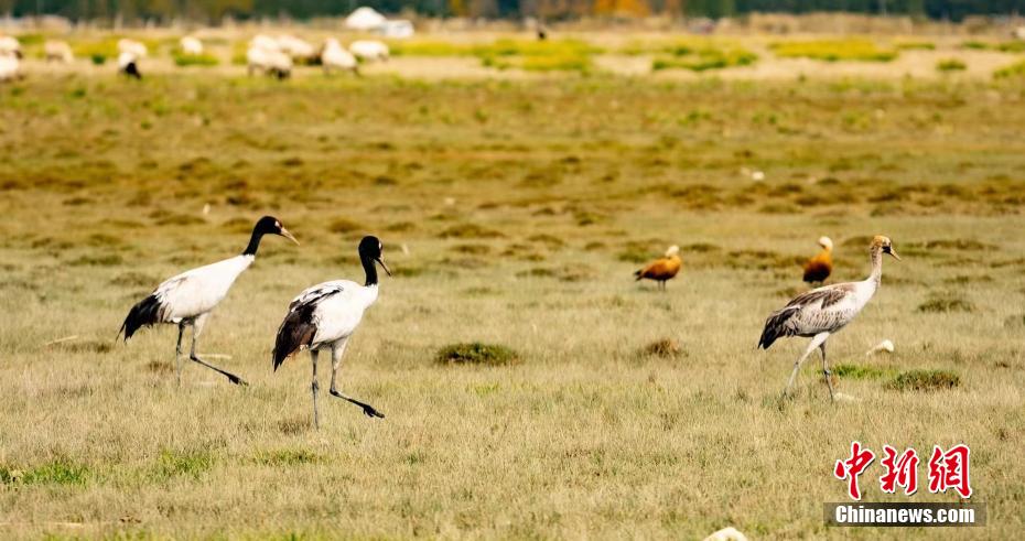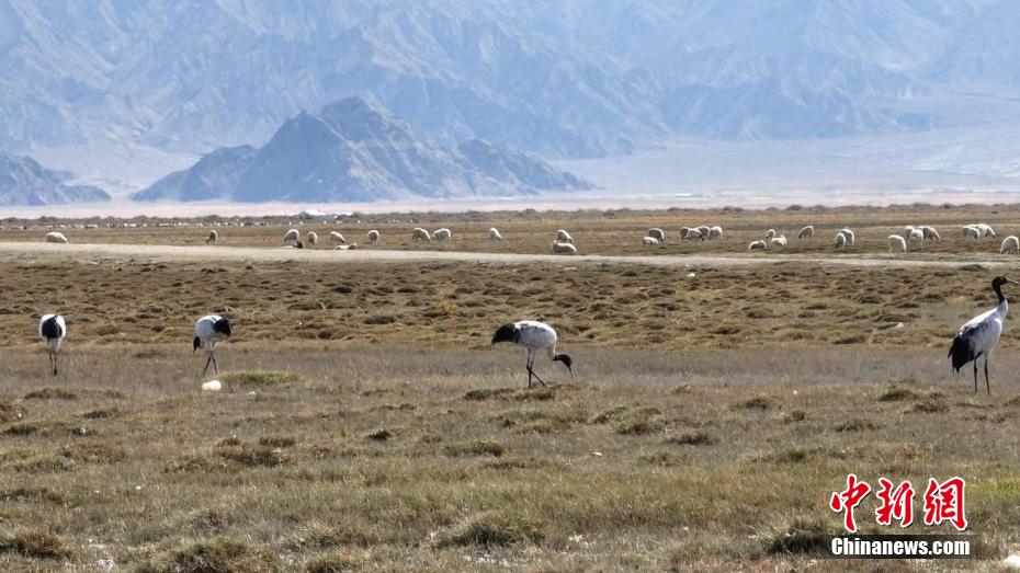 圖為黑頸鶴群在覓食。 烏蘭縣融媒體中心 供圖