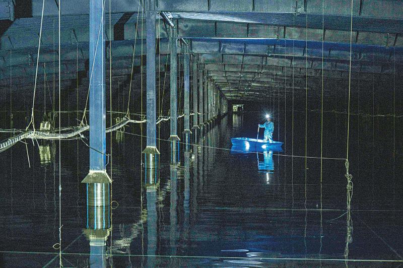 24日,陳明君和同事穿上潔凈服、戴上腳套,劃著小船進入伸手不見五指的三號水池,他們要逐一檢查維護這里的探測器單元和電子學箱。船劃到指定位置,黑暗中陳明君的頭燈光束直射水底,水下碩大的探測器單元核心設(shè)備——光電倍增管,被照得清晰可見,他和同事一起用“鉤子”把光電倍增管拉起,進行檢查?!八乩锏纳疃仁?.5米,這些純凈水的透明度比自來水高三倍以上,切倫科夫光就從里面捕獲。”陳明君告訴記者。