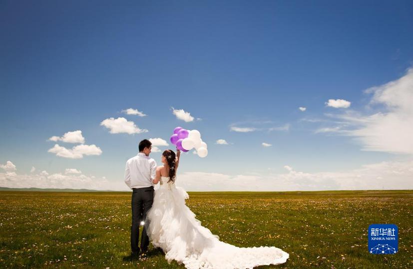 四川若爾蓋濕地國家級自然保護區(qū)鮮花盛開時節(jié),一對情侶在拍攝婚紗照(2022年6月24日攝)。新華社記者 江宏景 攝