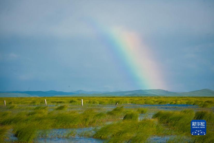 四川若爾蓋濕地國家級自然保護區(qū)若爾蓋花湖上空出現(xiàn)一道彩虹(2022年6月24日攝)。新華社記者 江宏景 攝