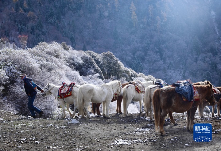 11月8日,工作人員在四姑娘山長坪溝景區(qū)內牽馬行走。新華社記者 劉瓊 攝