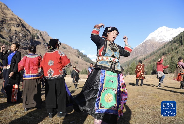 11月5日,小金縣向花村村民在雪山下跳鍋莊舞。新華社記者 劉瓊 攝