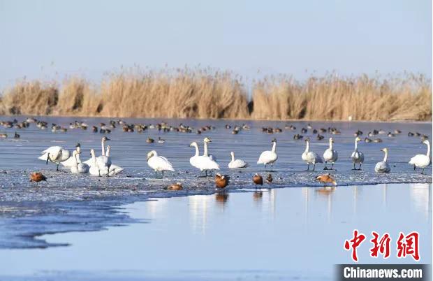 圖為大天鵝等越冬水鳥在湖邊覓食嬉戲。青海省林草局供圖