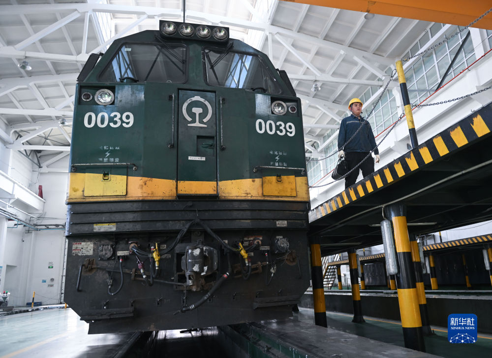 2月4日,在格爾木機務(wù)段檢修車間,馬國仁在巡檢機車。新華社記者 張龍 攝