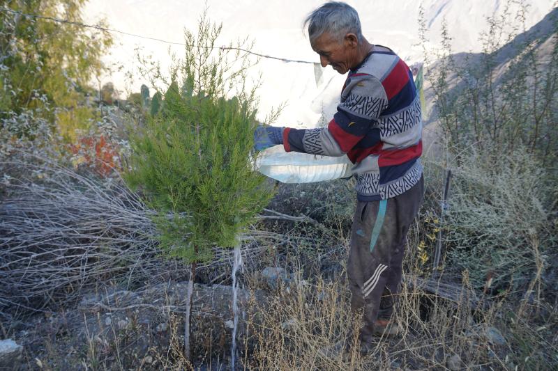 1950年出生在茂頂村木達(dá)水村民小組的丁爭,小時(shí)候多次看到雨季村里洪水成災(zāi),泥石流橫行,山體滑坡的場景。那時(shí)經(jīng)濟(jì)落后,村民日子過得苦。丁爭隨母親去頭人家放牛,由于天氣炎熱,饑渴難耐,母親就摘一個(gè)頭人家蘋果充饑,被頭人關(guān)了3天3夜。1957年,迪慶發(fā)展迎來新曙光,丁爭家分到了田、牲畜、果樹,當(dāng)家做主人,從此過上了新生活。2007年,丁爭兒孫滿堂,家務(wù)事不用操心,他就想植樹造林、保護(hù)生態(tài),防止山洪暴發(fā)和水土流失,造福子孫后代。于是,他拿著家里的鎬、盆,踏上植樹造林的漫漫長路。 在植樹造林的初期,丁爭老人靠自家的舊桶舊盆給樹苗澆水。隨著旭龍電站、忠態(tài)水庫等項(xiàng)目進(jìn)場施工,丁爭老人就撿拾一些舊水管、舊鐵絲,把水引到離幼苗最近的地方,以便澆水。用廢棄的鐵絲把樹苗固定好,以免風(fēng)吹雨打樹苗飄搖致根系斷裂,影響生長。起初由于管理經(jīng)驗(yàn)不足,澆水困難,1年種100棵樹苗,成活僅幾棵,但他沒有退縮,沒有喪失信心,查找成活率不高的原因,采取相應(yīng)的改進(jìn)措施,逐年提高了樹苗成活率。