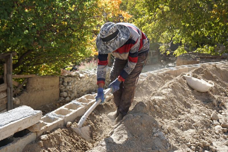 丁爭老人正在修建村里的小花園。