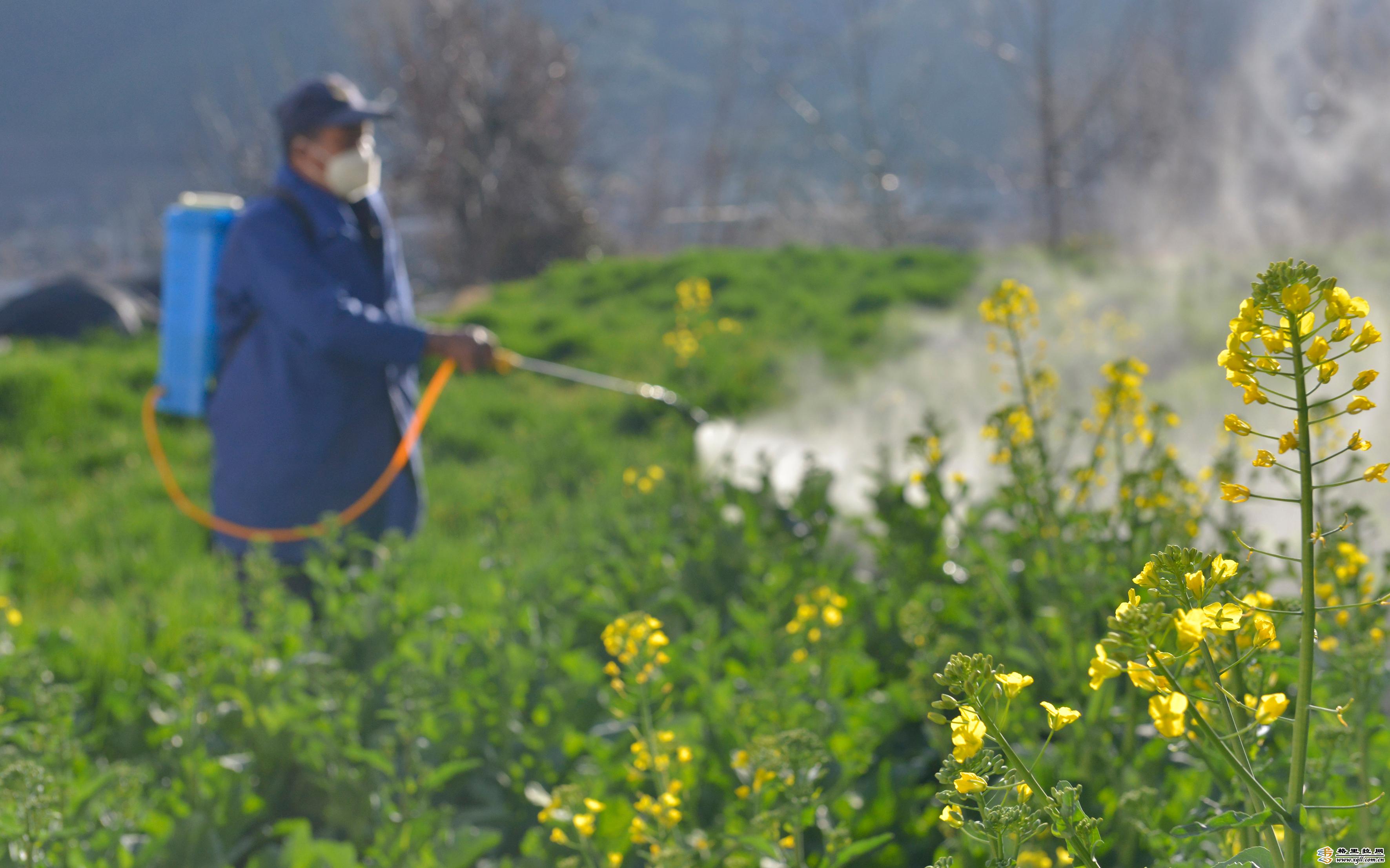 各地農(nóng)民搶抓農(nóng)時進行田間管理,圖為香格里拉市金江鎮(zhèn)吾竹村格瓦組村民和麗光在油菜地里噴灑農(nóng)藥。
