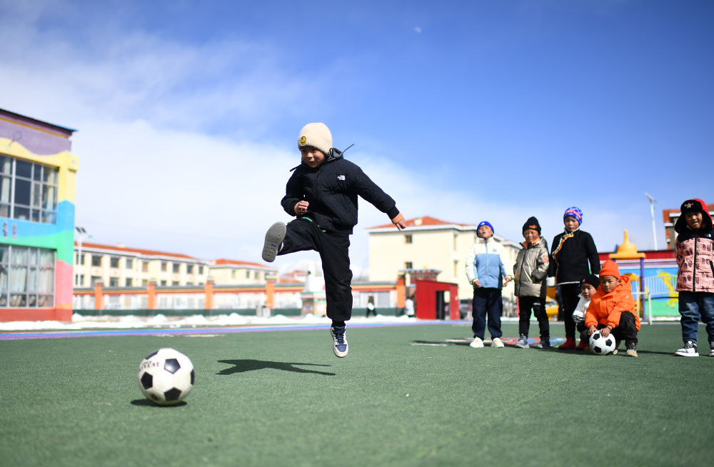 3月1日,在玉樹(shù)州治多縣,城南幼兒園小朋友桑周尼瑪(前)在練習(xí)射門。新華社記者 張宏祥 攝