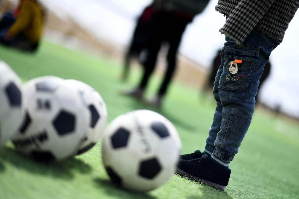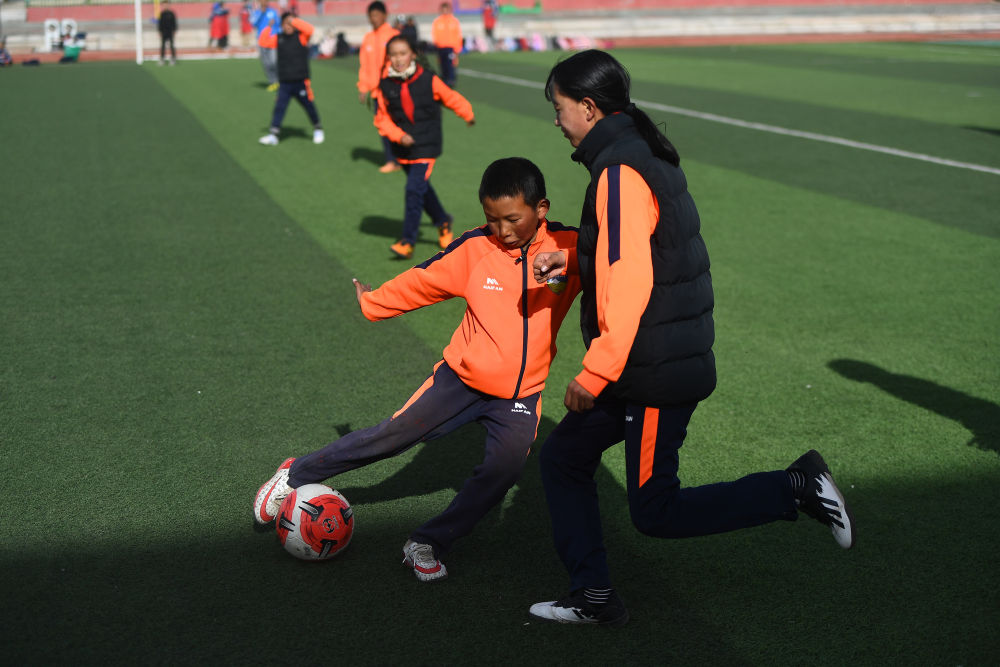 3月1日,在玉樹(shù)州治多縣,城南幼兒園小朋友旦增然桑(左一)在練習(xí)射門。新華社記者 張宏祥 攝