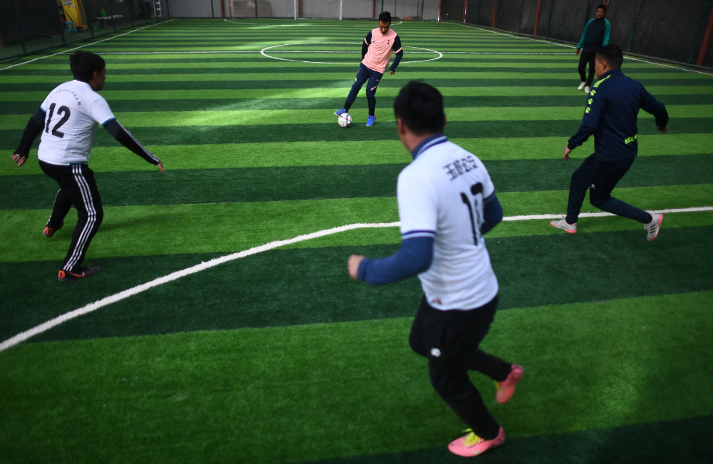 3月2日,在玉樹(shù)州玉樹(shù)市一處室內(nèi)球場(chǎng),幾名足球愛(ài)好者正在踢球。新華社記者 張宏祥 攝