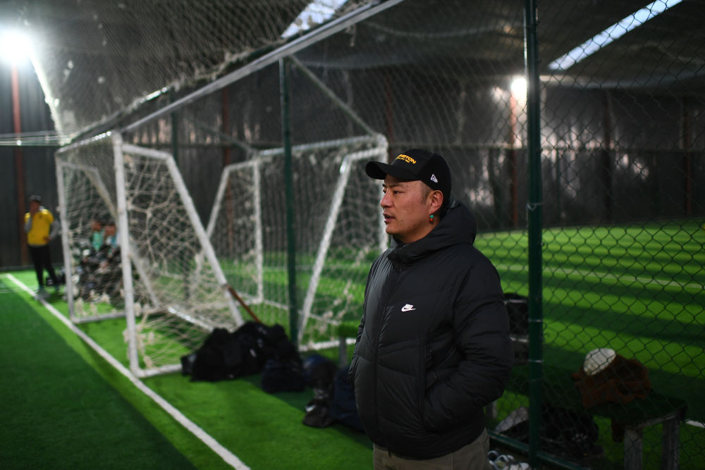 3月2日,在玉樹(shù)州玉樹(shù)市一處室內(nèi)球場(chǎng),玉樹(shù)康巴野牦牛足球隊(duì)領(lǐng)隊(duì)格萊永培觀看比賽。新華社記者 張宏祥 攝