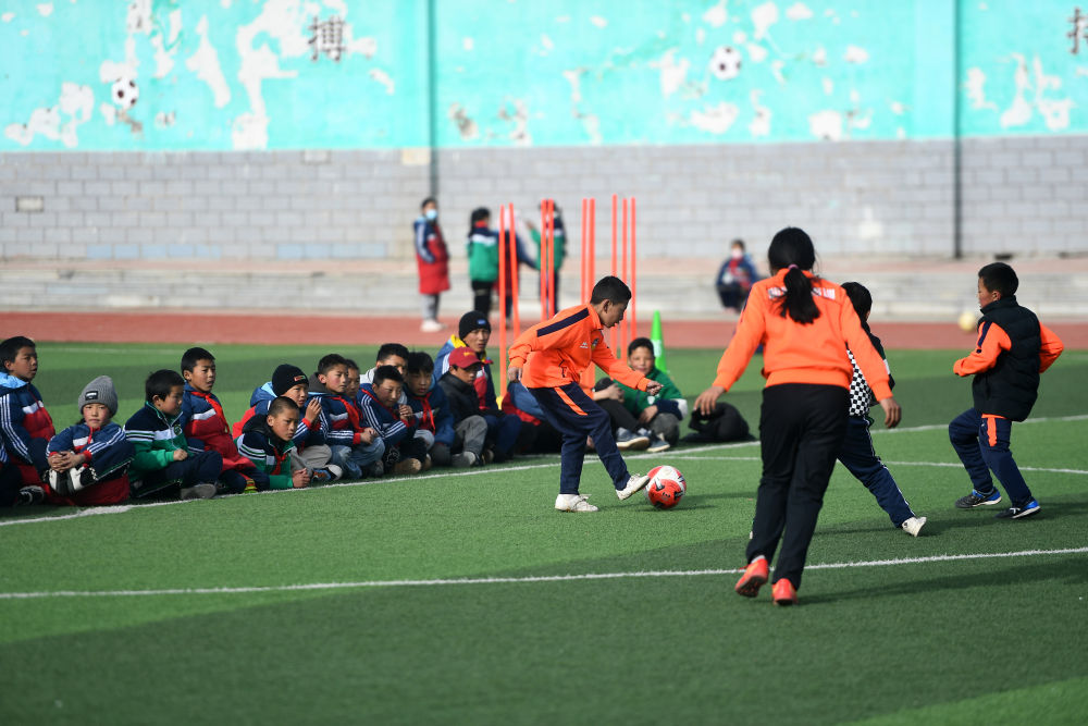 3月1日,在玉樹(shù)州曲麻萊縣第一完全小學(xué),曲麻萊青訓(xùn)隊(duì)球員在訓(xùn)練課上。新華社記者 張宏祥 攝