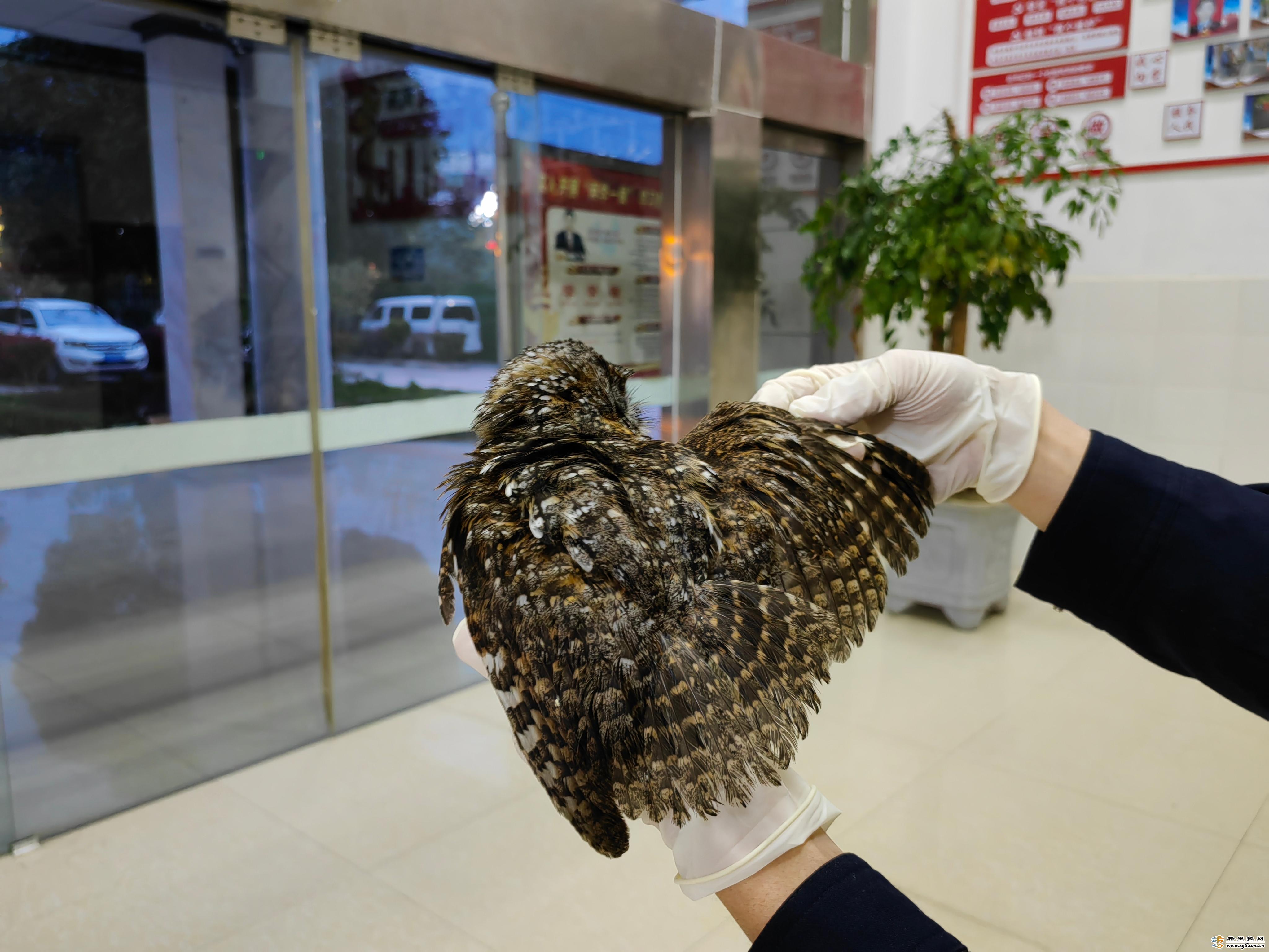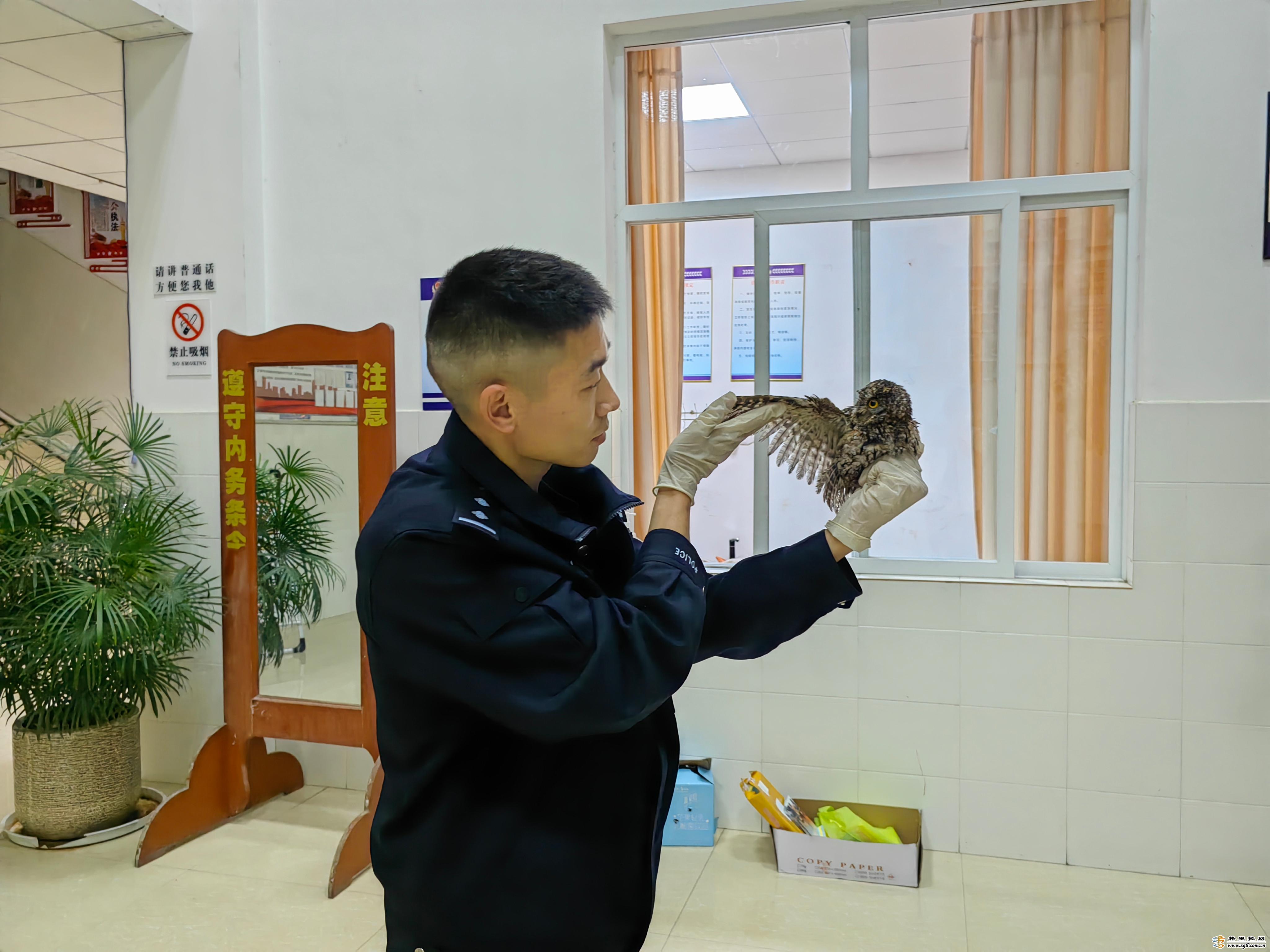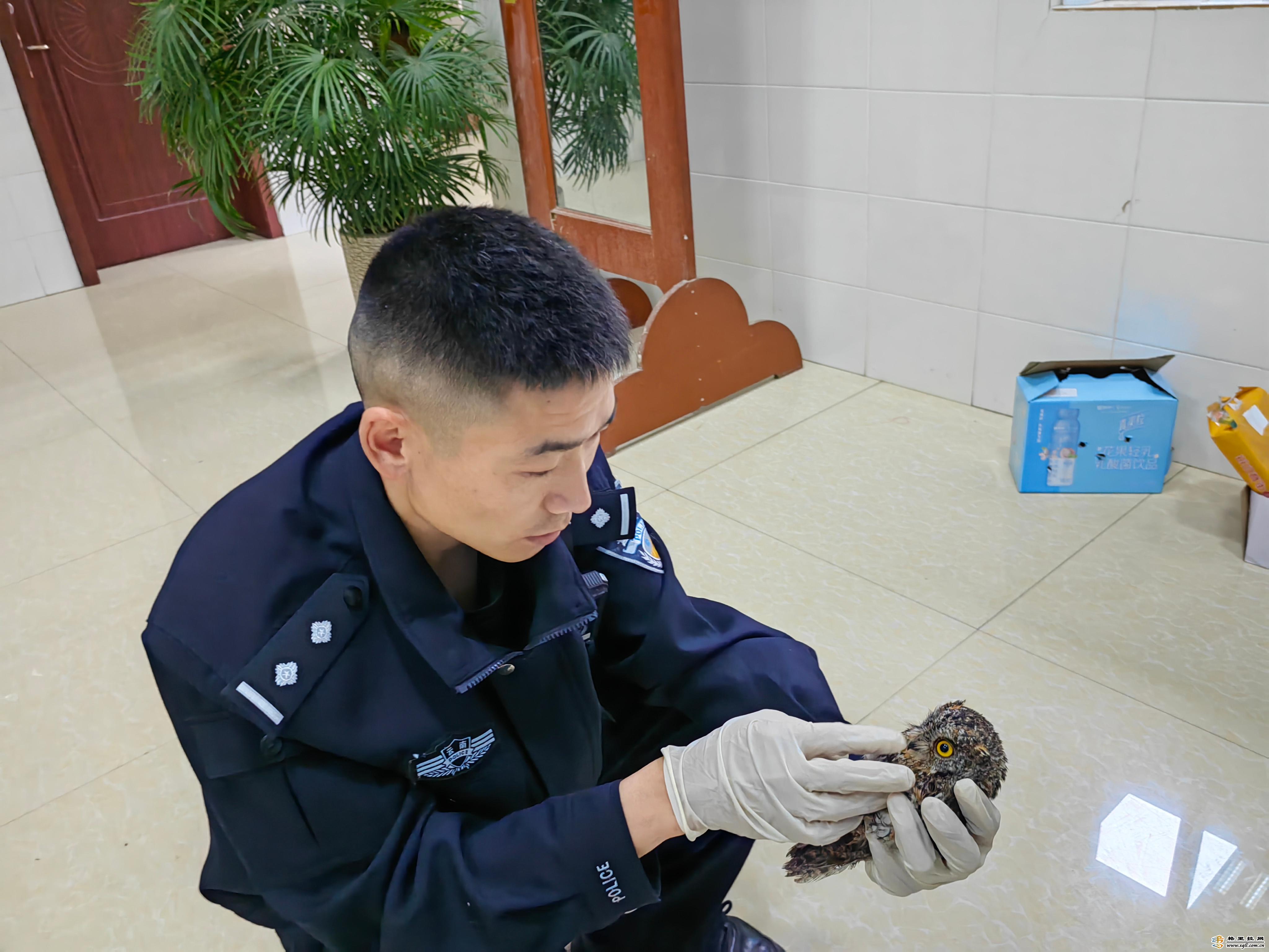 經(jīng)民警仔細(xì)查看并咨詢相關(guān)林業(yè)專業(yè)人員,確定這是一只紅角鸮,屬國家二級野生保護動物,因部分羽毛是濕的,故無法飛行。當(dāng)晚,民警待其羽毛干透后再次進行了仔細(xì)檢查,未發(fā)現(xiàn)體表傷,具備放生條件,于是民警將該紅角鸮帶至野外進行了放生。