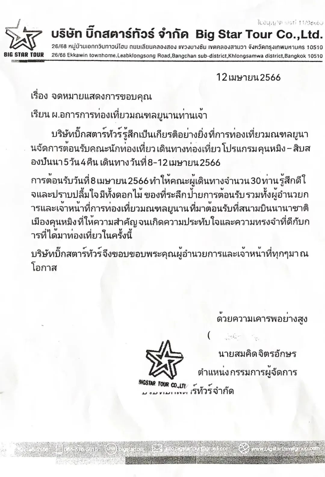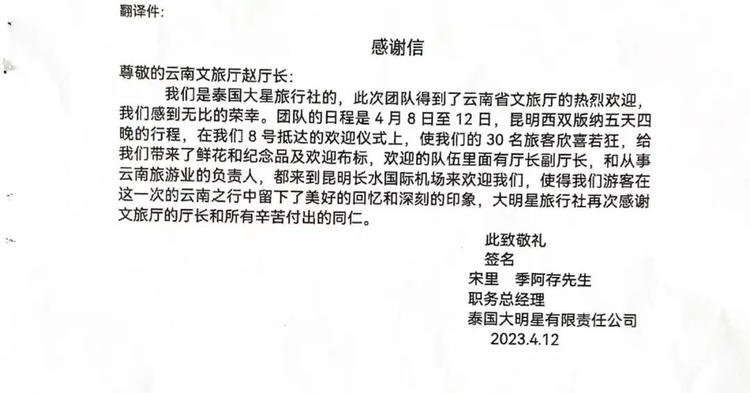 “在這四晚五天的云南之行中,我們無(wú)時(shí)無(wú)刻不心懷感激感恩之情,此次旅途給我們留下了深刻的印象。開(kāi)心快樂(lè)一路相隨,云南的風(fēng)景美、人更美,一路上遇到的人,對(duì)待外國(guó)游客是多么的友善和可愛(ài)?!比涨埃环鈱?xiě)有30位泰國(guó)游客名字的感謝信送到云南省文化和旅游廳,字里行間中透露著真摯情感和濃濃的感謝之意,傳遞著泰國(guó)游客對(duì)云南的喜愛(ài),對(duì)云南之行的滿(mǎn)意……