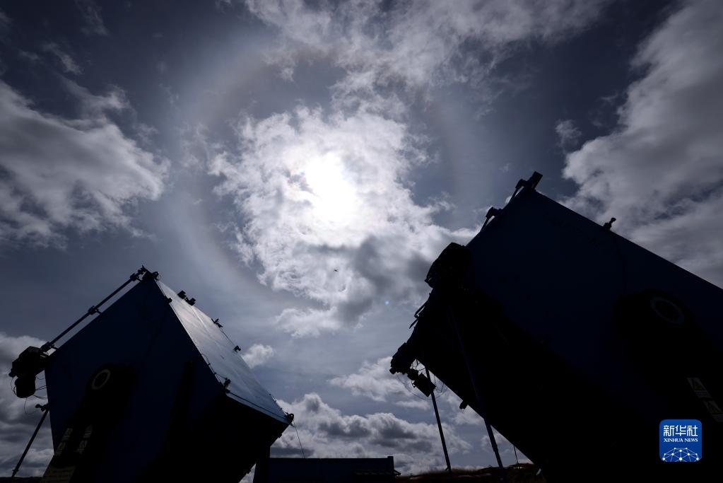 4月22日,高海拔宇宙線觀測(cè)站觀測(cè)基地廣角切倫科夫望遠(yuǎn)鏡上空出現(xiàn)日暈。新華社記者 金立旺 攝