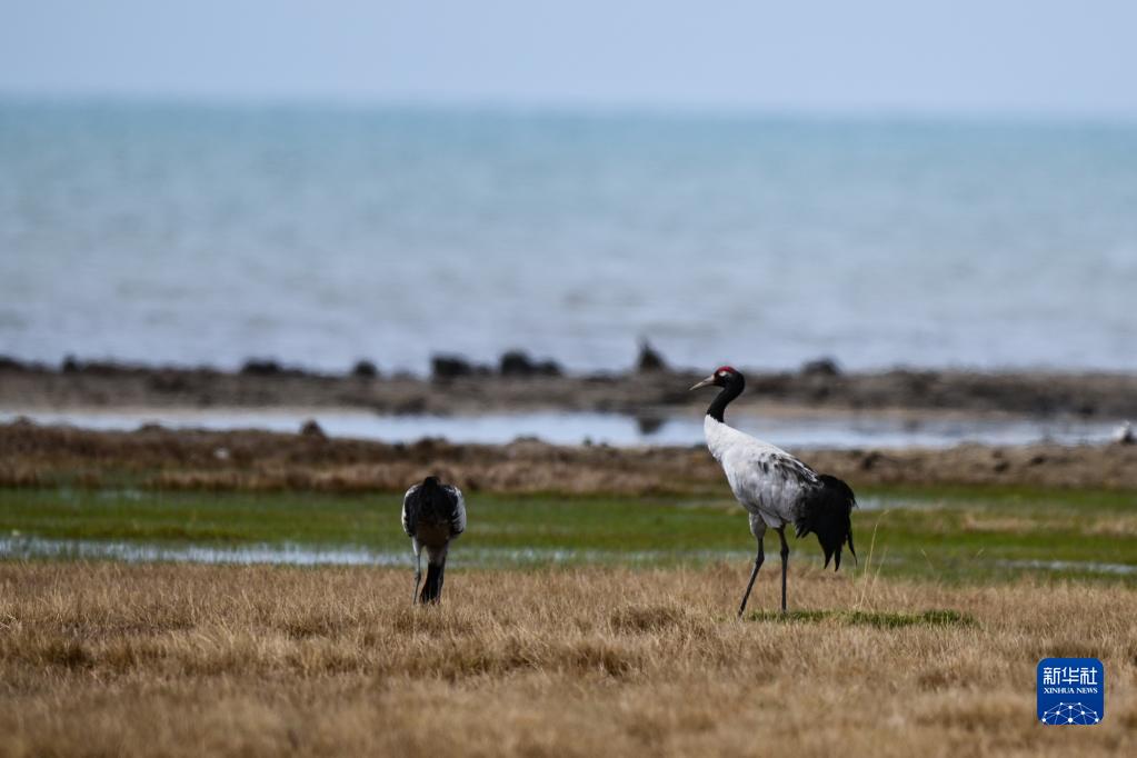 這是5月17日在青海省海北藏族自治州剛察縣境內(nèi)的青海湖仙女灣景區(qū)拍攝的黑頸鶴。新華社記者 解統(tǒng)強(qiáng) 攝