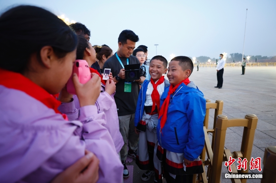 圖為青少年在天安門(mén)廣場(chǎng)看升旗。中新社記者 富田 攝