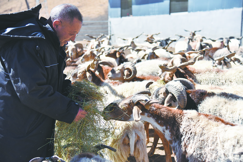 在自家“生態(tài)家庭牧場”給賈洛羊補飼的文格。李興發(fā) 攝