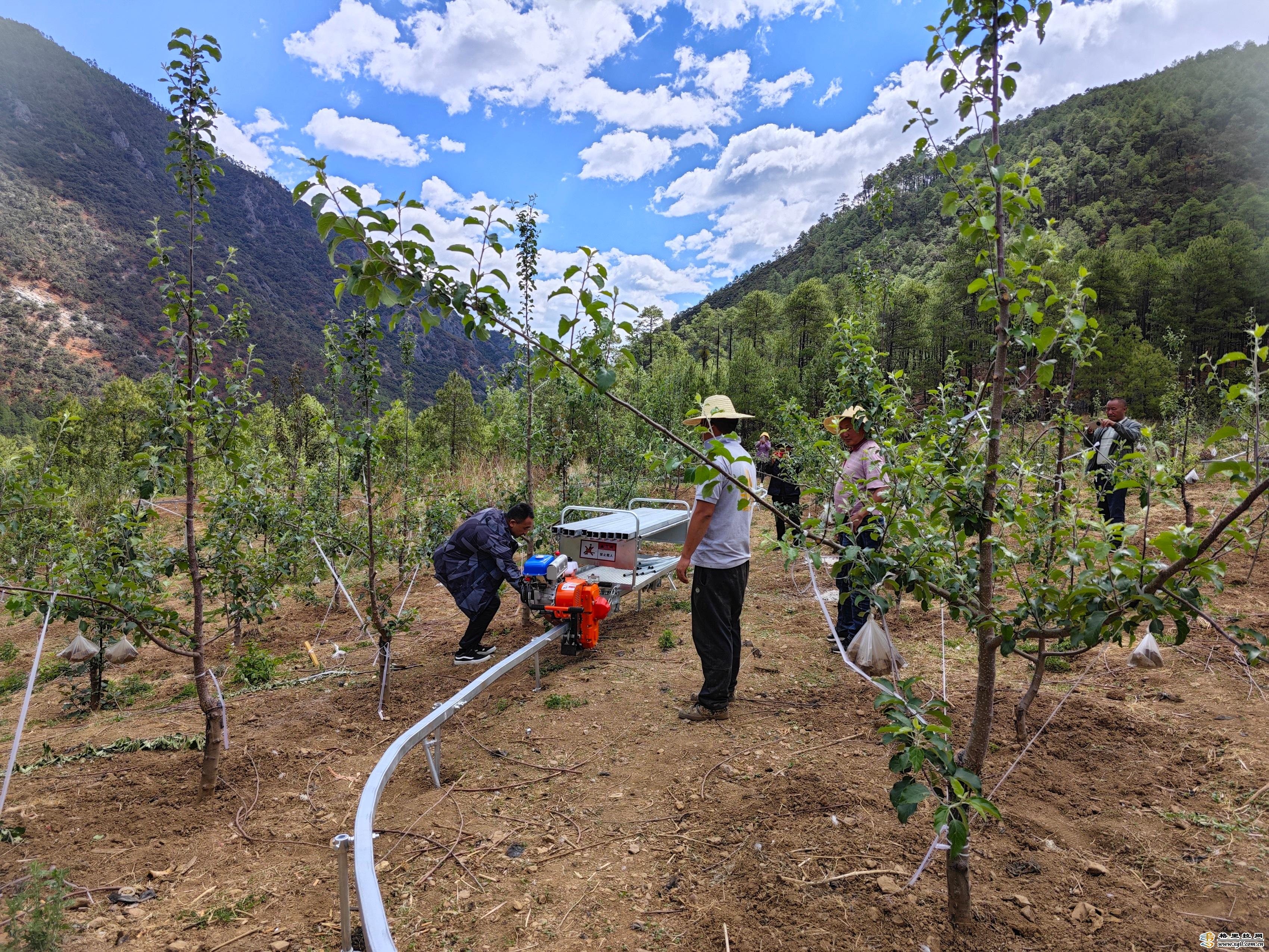 伴隨著鐵軌上傳來(lái)“哐哐”聲,香格里拉市洛吉鄉(xiāng)九龍村干溝組村民馬志高的蘋果園里,一輛果園軌道運(yùn)輸車正在試運(yùn)行。
