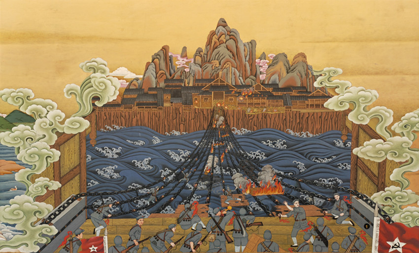 巨幅唐卡《紅星照耀雪域》中的飛奪瀘定橋場(chǎng)景?!凹t色非遺根植中華文化故土,富含深刻的革命文化,它代表了中華文化中先進(jìn)的、優(yōu)秀的部分,紅軍長(zhǎng)征更是文學(xué)藝術(shù)創(chuàng)作取之不盡用之不竭的源泉。[詳細(xì)]