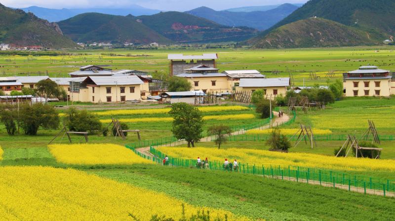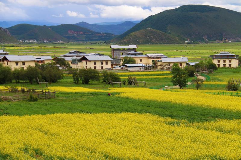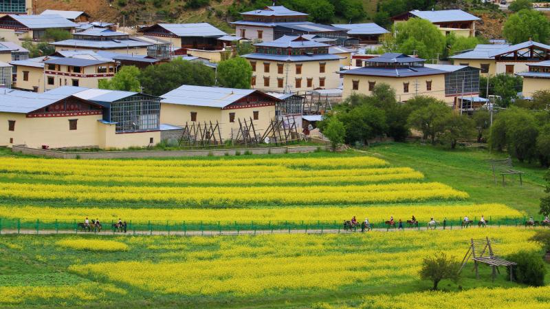 黃色的花海中藏房零星散落其間