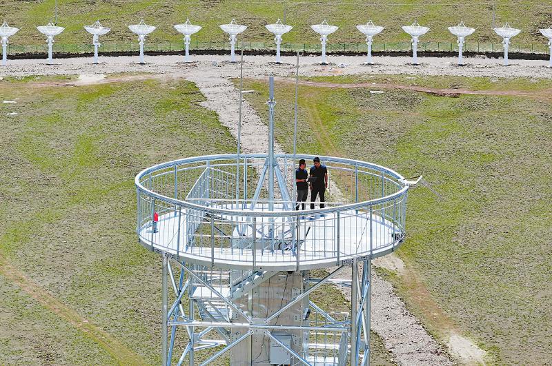 7月7日,技術(shù)人員在百米高的子午工程二期定標(biāo)塔上調(diào)試設(shè)備。
