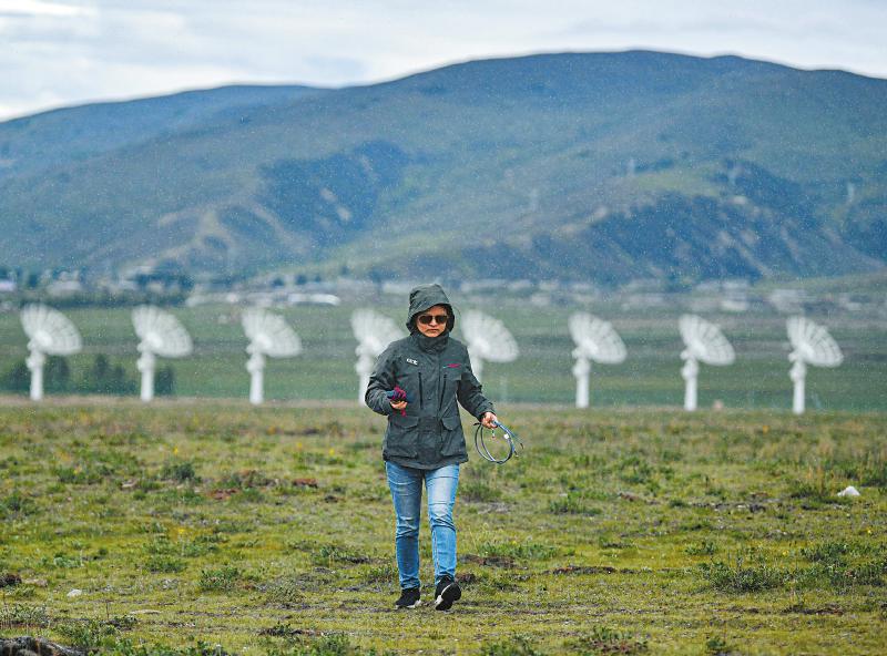 7月8日,四川省甘孜州稻城縣噶通鎮(zhèn)天氣說變就變。在國家重大科技基礎(chǔ)設(shè)施——空間環(huán)境地基綜合監(jiān)測網(wǎng)(子午工程二期)圓環(huán)陣太陽射電成像望遠鏡項目建設(shè)現(xiàn)場,中國電科第39研究所現(xiàn)場施工負(fù)責(zé)人葉愛林和同事正在進行天線增益調(diào)試實驗。突然,一道閃電劃過天際,轟隆隆的雷聲過后便是傾盆大雨,葉愛林和同事不得不停下手中正在進行的實驗,臨時找地方躲雨?!斑@雨下不了多久,等雨停了,我們再繼續(xù)?!痹陧椖拷ㄔO(shè)現(xiàn)場已工作了480多天的他,被同事們稱作半個氣象“土專家”。他不僅能“察言觀色”看懂高原上的云彩,還能大差不差地推測出天氣變化。在海拔3800多米的噶通鎮(zhèn),許多科研人員像葉愛林一樣,默默奮戰(zhàn),希望在建的這一國家重大科技基礎(chǔ)設(shè)施能早日運行,為中國空間科學(xué)事業(yè)的發(fā)展提供關(guān)鍵性的探索幫助及技術(shù)支持,使我國步入世界空間科學(xué)領(lǐng)域的先進行列。