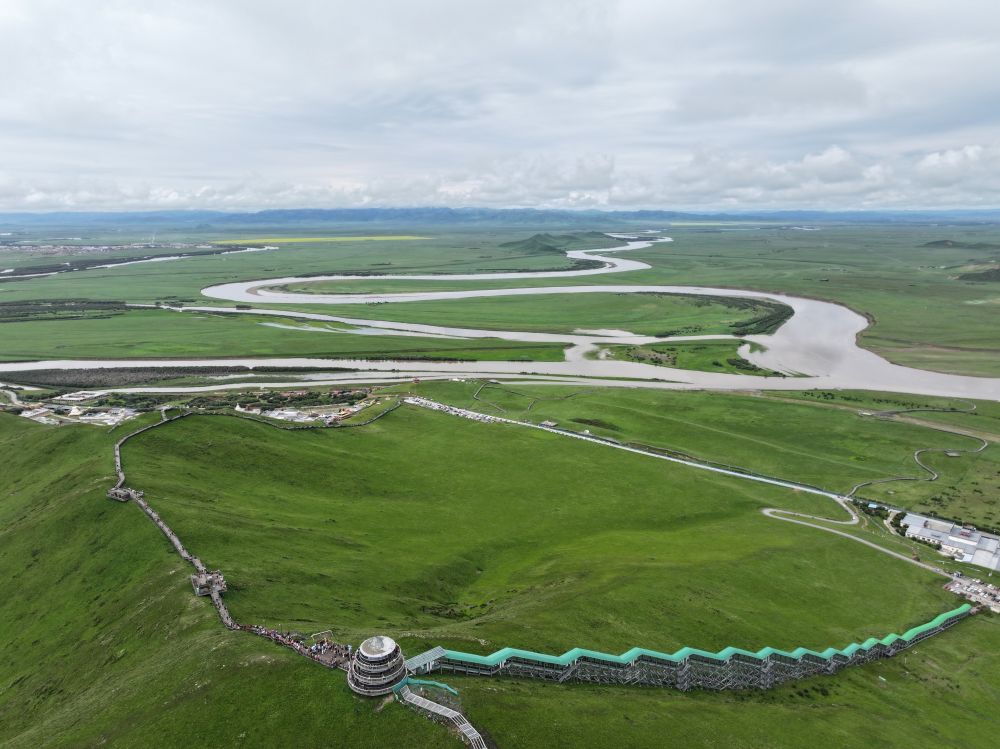 這是7月14日拍攝的若爾蓋縣黃河九曲第一灣景區(qū)(無(wú)人機(jī)照片)。新華社記者 邢拓 攝