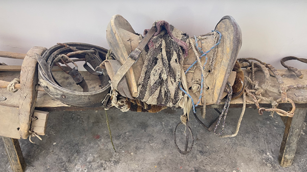 圖為五里村村史館展覽的過去運輸貨物和生活必需品上山的馬駝用具。新華網(wǎng) 陳穎 攝