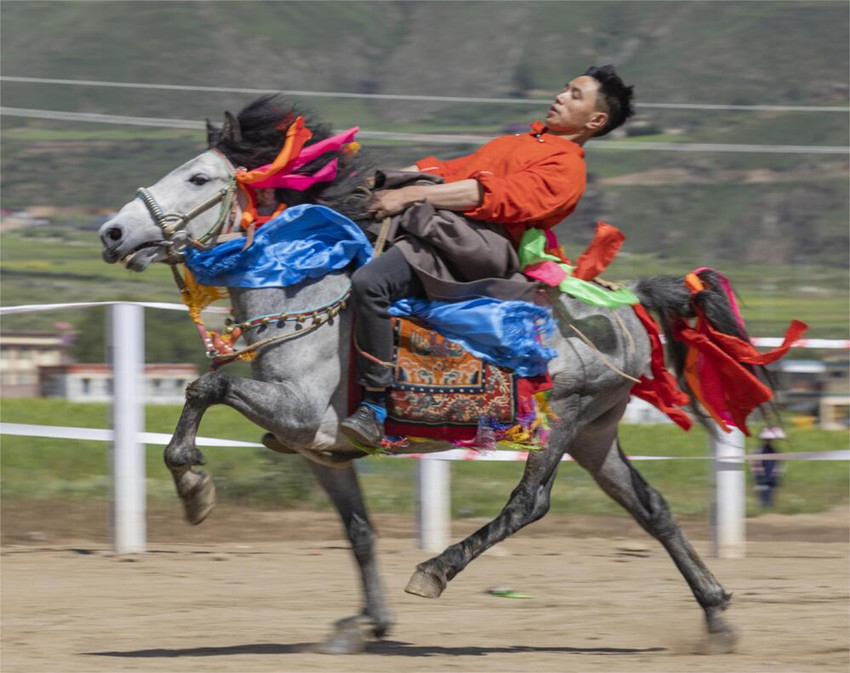 走馬賽場塵土飛揚(yáng),馬兒四蹄快速且有節(jié)奏地蹬地,馬身卻平穩(wěn)地從眼前呼嘯而過,飛速穿過終點(diǎn),看得人眼花繚亂。7月17日上午,“2023四川甘孜山地文化旅游節(jié)”活動之一的走馬表演活動,在被譽(yù)為“中國走馬之鄉(xiāng)”的甘孜縣來馬鎮(zhèn)會師走馬場上舉行,吸引省內(nèi)外上千游客前來欣賞。