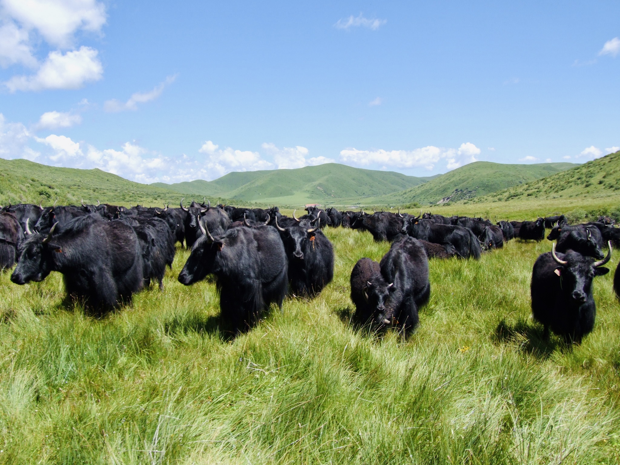 “天蒼蒼,野茫茫,風(fēng)吹草低見牛羊?!标柟饷髅牡南募?,在紅原縣公路兩邊隨處可見悠然吃草的牦牛和藏綿羊,令人心曠神怡。