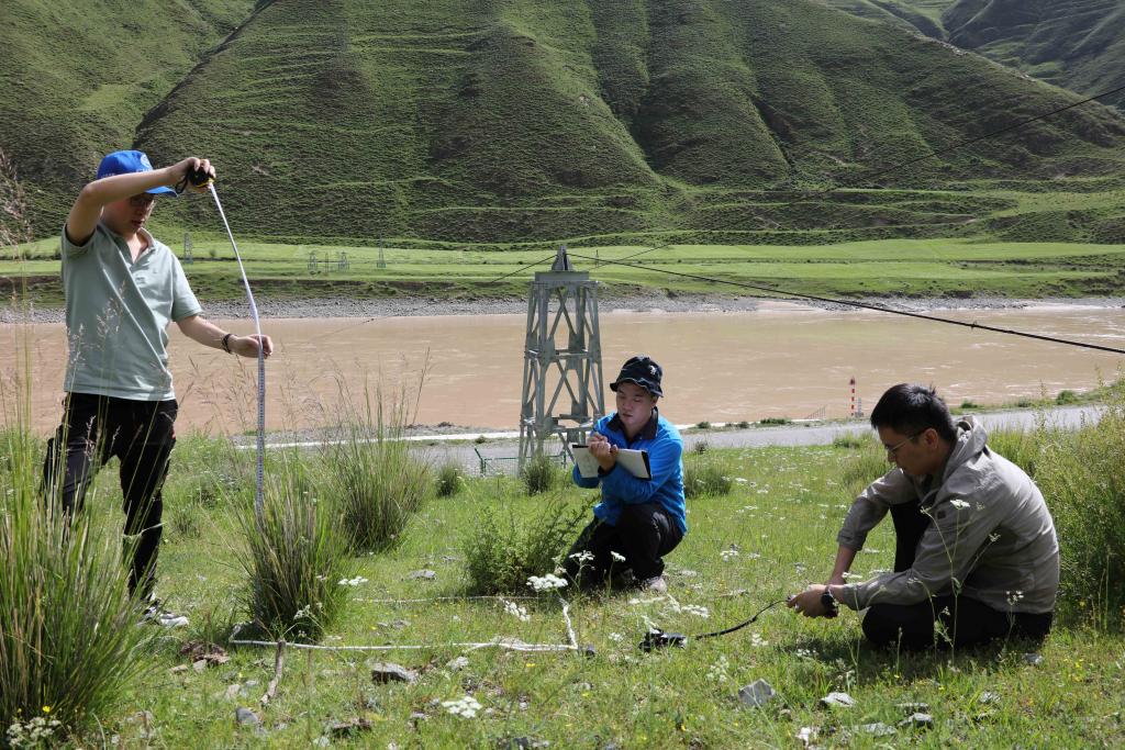7月22日,長(zhǎng)江科學(xué)院水土保持研究所的科考隊(duì)員在通天河直門達(dá)河段進(jìn)行植被樣方調(diào)查。新華社記者 劉詩(shī)平 攝