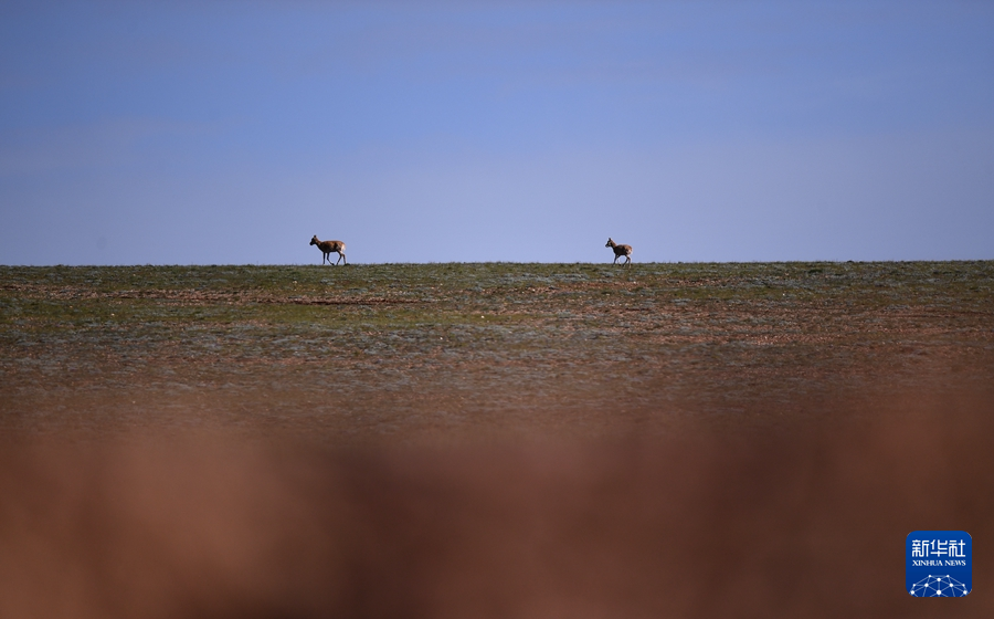 7月27日,兩只藏羚羊在可可西里境內(nèi)活動。新華社記者 張宏祥 攝
