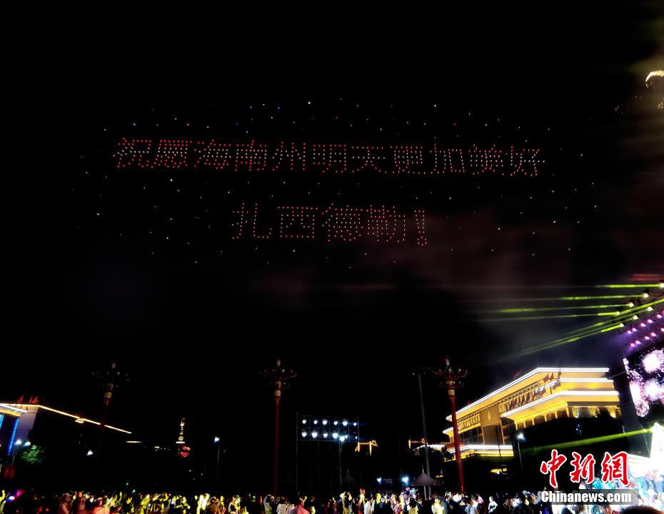 圖為無(wú)人機(jī)秀現(xiàn)場(chǎng),無(wú)人機(jī)組成“祝愿海南州明天更加美好?扎西德勒”字樣。祁增蓓 攝