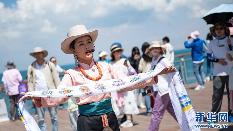 8月2日,青海湖二郎劍景區(qū)工作人員為游客獻(xiàn)上精美的舞蹈。新華網(wǎng) 潘彬彬 攝