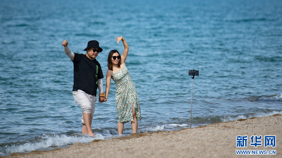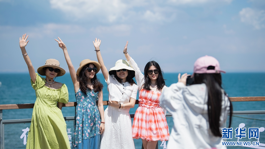 8月2日,游客在青海湖二郎劍景區(qū)拍照留念。新華網(wǎng) 潘彬彬 攝