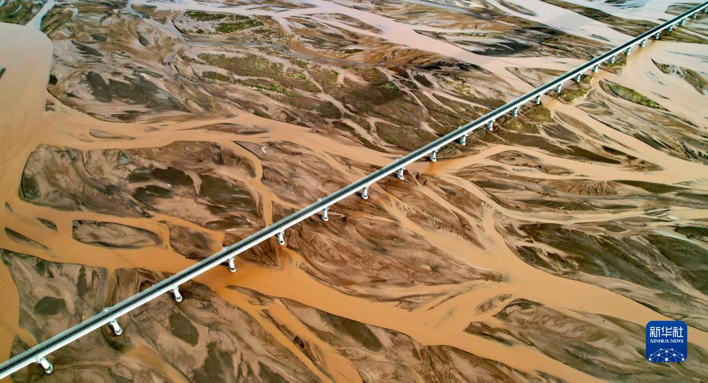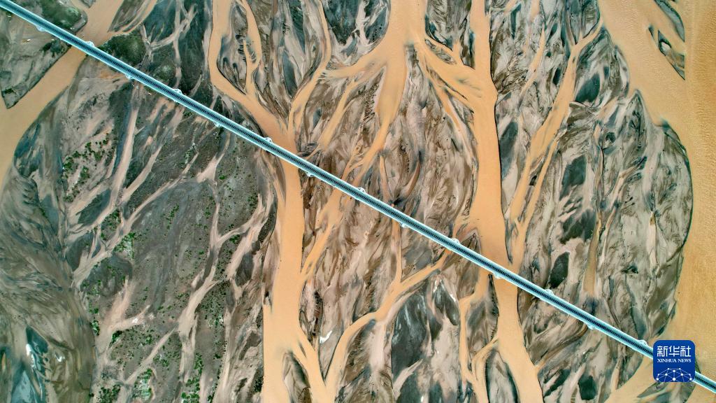 青藏鐵路跨過(guò)沱沱河的辮狀河道(7月26日攝,無(wú)人機(jī)照片)。新華社記者 劉詩(shī)平 攝