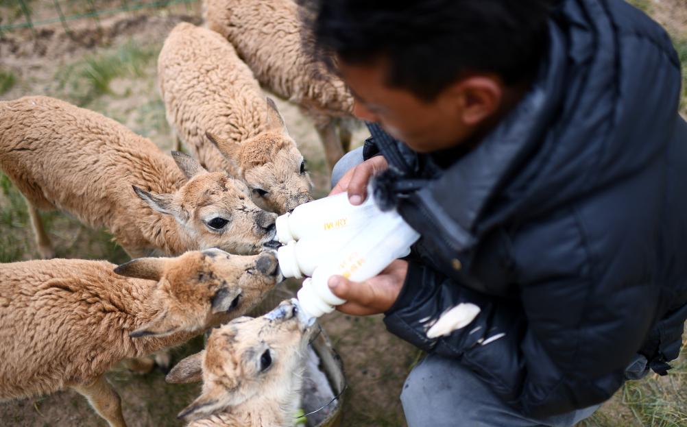 可可西里管理處索南達杰保護站隊員才仁多杰在給被救助的藏羚羊幼仔喂奶(7月28日攝)。新華社記者 張宏祥 攝