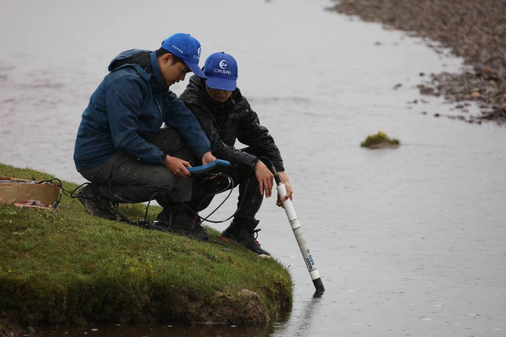 來(lái)自長(zhǎng)江科學(xué)院河流研究所的科考隊(duì)員徐志成和楊緒海,每到一個(gè)采樣點(diǎn)就采集河道床沙和懸沙樣品,測(cè)量河寬、水深、比降、流速,對(duì)比此前科考觀(guān)測(cè)數(shù)據(jù),分析長(zhǎng)江源區(qū)河道水沙輸移特性和河床演變情況。